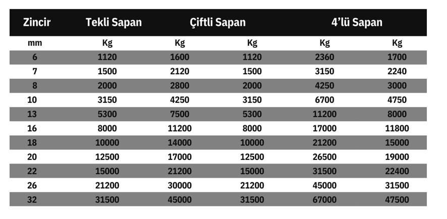 GR-80 Zincir Sapan Yapım İçin Malzeme Seçim Tablosu